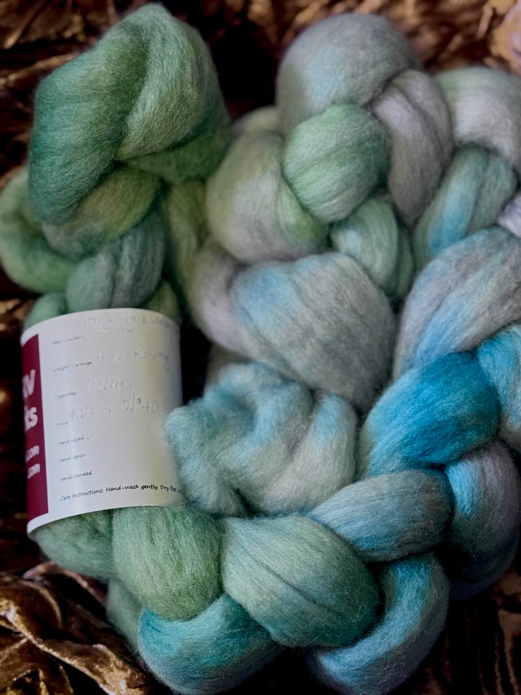 4 oz roving of 25 micron Falklands Wool dyed in soothing shades of blue and green. Buttery soft and drafts like a dream for spinners. Will felt easily.